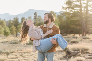 A man in a brown jacket holds a laughing woman in a field, capturing their engagement amidst the vibrant hues of Fall, with mountains and trees in the background on a sunny Hope Valley day.