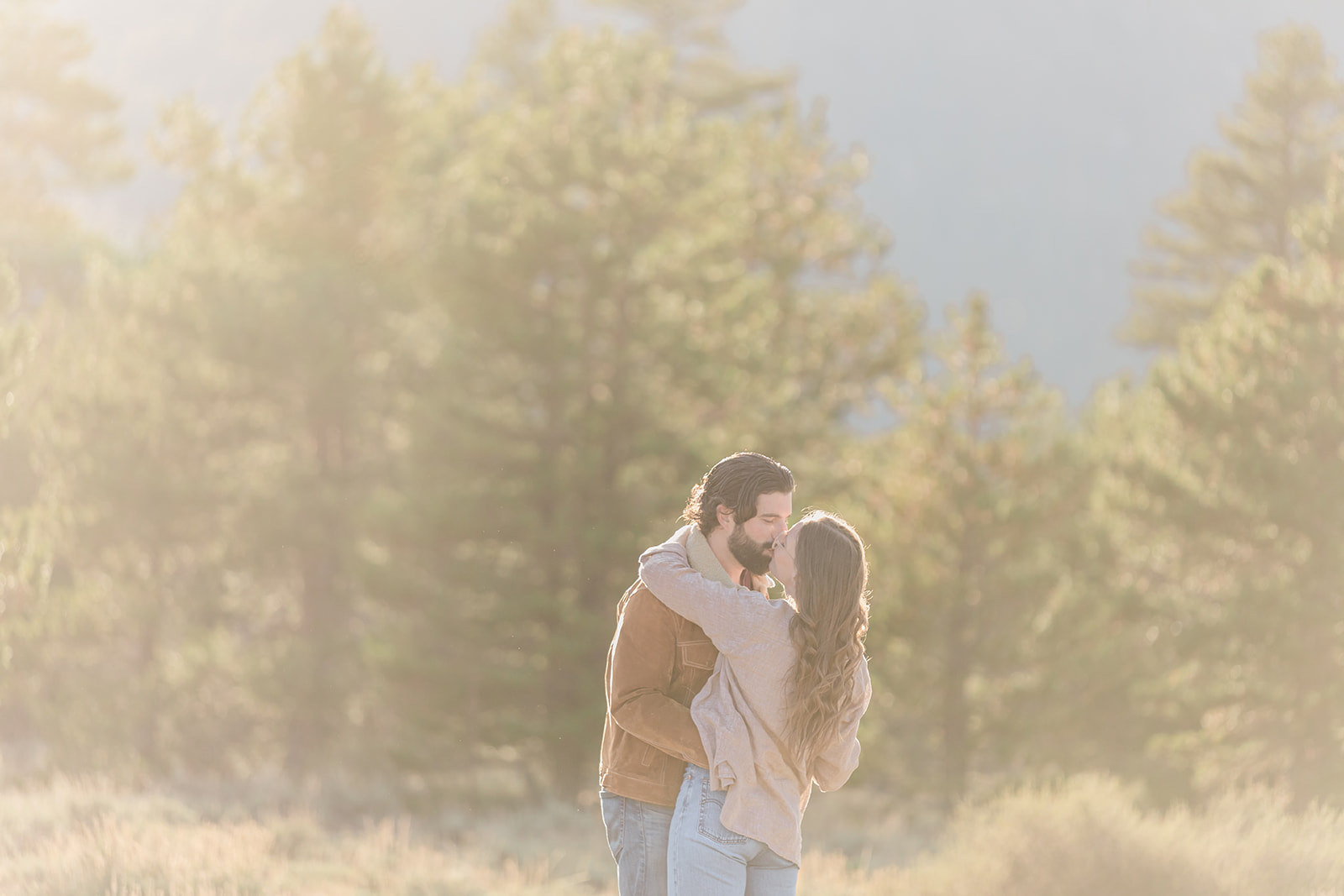 Josh & Mackenzie embrace outdoors in a sunlit forest setting, surrounded by tall trees, capturing the essence of their Fall Hope Valley Engagement Session.