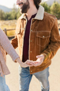 In a sunny, natural setting, Josh and Mackenzie share a tender moment during their engagement session, both wearing cozy jackets that capture the essence of fall in Hope Valley.