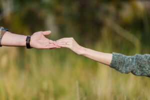 Two hands reaching for each other outdoors; the left hand wearing a watch, and the right adorned with a ring on the ring finger. Captured beautifully in this Hope Valley Engagement session, it perfectly encapsulates Josh & Mackenzie’s connection amidst the enchanting fall backdrop.