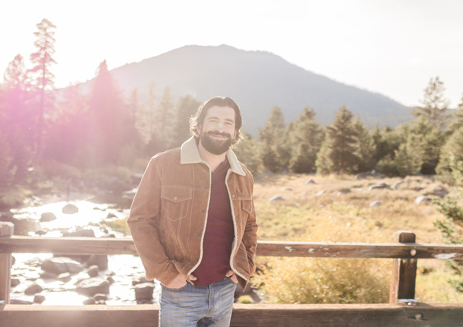 A person with a beard stands on a wooden bridge in Hope Valley, surrounded by a breathtaking mountain landscape. Dressed in a brown jacket and jeans, they savor the crisp air of fall under a bright sky, capturing the essence of an engagement session.