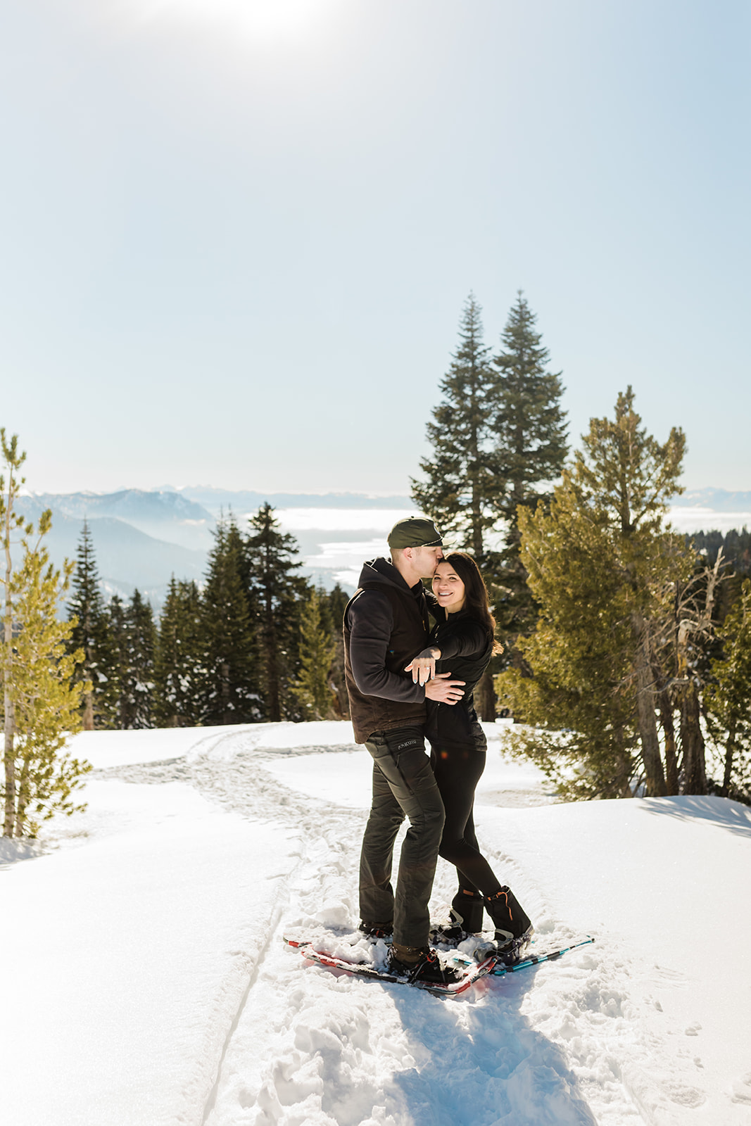 A couple stands close together on snowshoes in a snowy mountain landscape near evergreen trees beneath a clear sky, capturing the magic of a Lake Tahoe Winter Proposal.