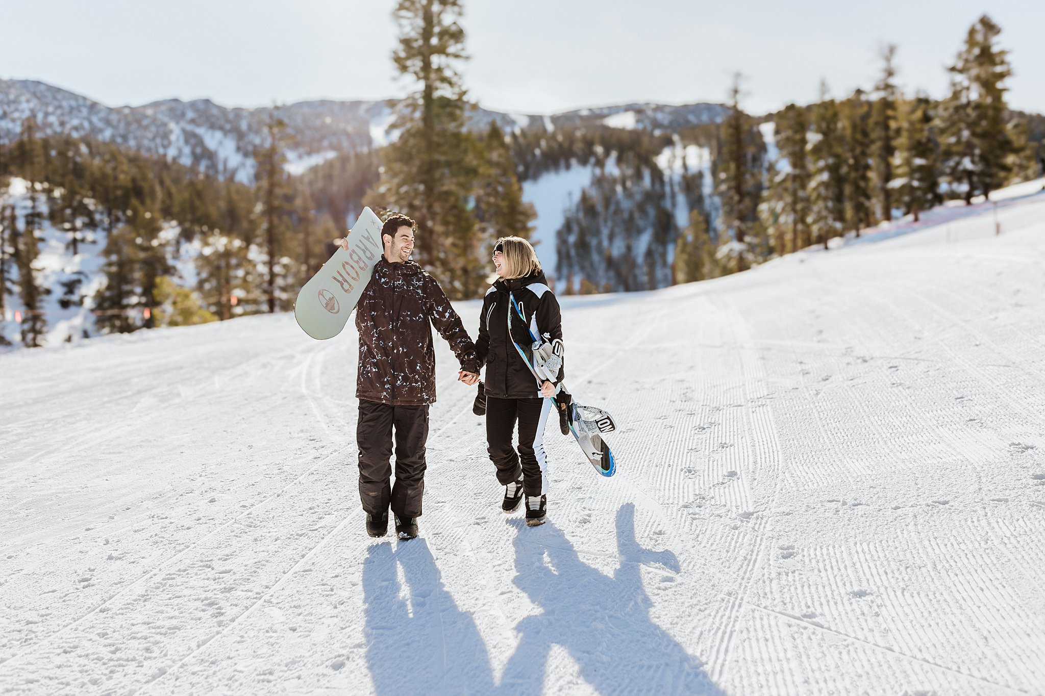 Two people dressed in winter gear walk hand in hand on a snowy slope, each carrying a snowboard, with trees and mountains in the background—capturing the magic of a Lake Tahoe Winter Proposal.