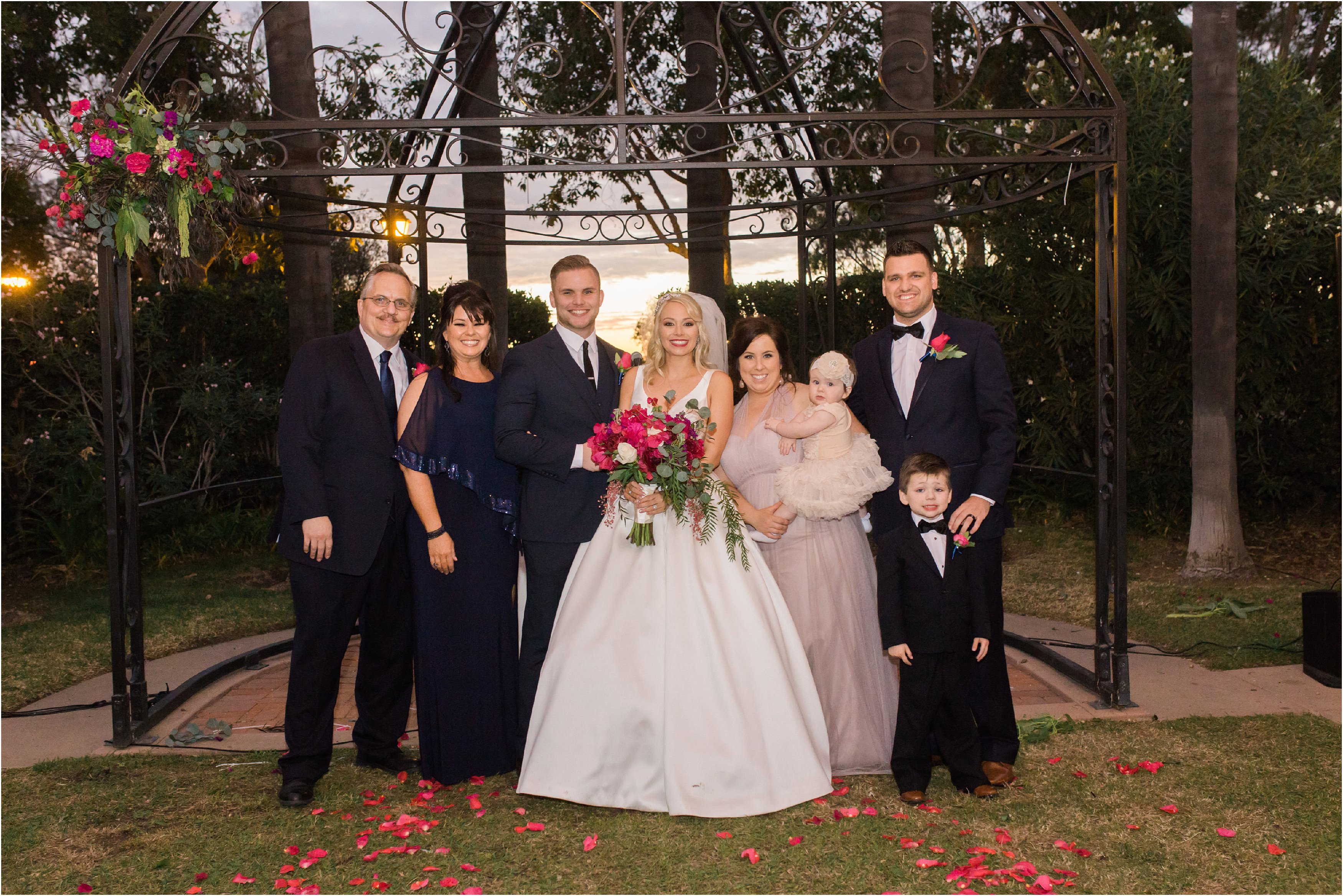 An outdoor wedding ceremony with the couple at the altar, surrounded by bridesmaids in light dresses and groomsmen in grey suits, with guests seated and trees in the background.
