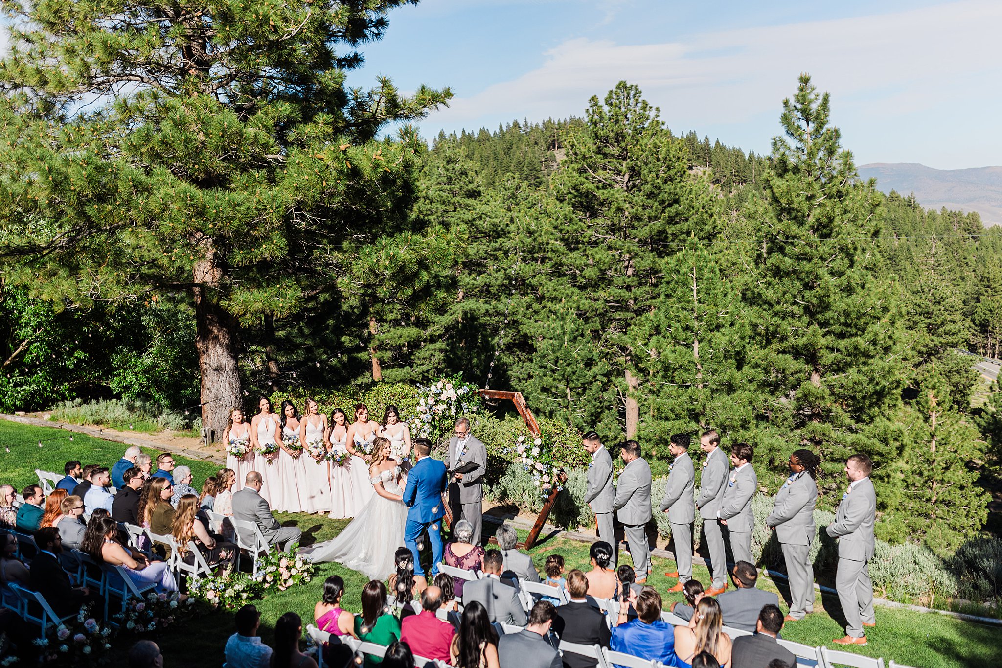 An outdoor wedding ceremony with the couple at the altar, surrounded by bridesmaids in light dresses and groomsmen in grey suits, with guests seated and trees in the background.