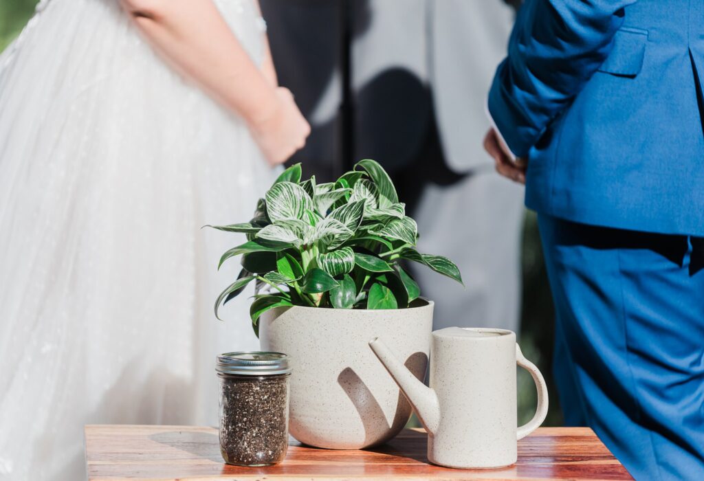 Set under the trees with the valley in the distance, their ceremony was tender, heartfelt, and uniquely theirs. Instead of a sand or candle unity ritual, they planted a houseplant together in shared soil—symbolizing the roots they’ve already grown. (This was SUCH a perfect reflection of their relationship and home life.)