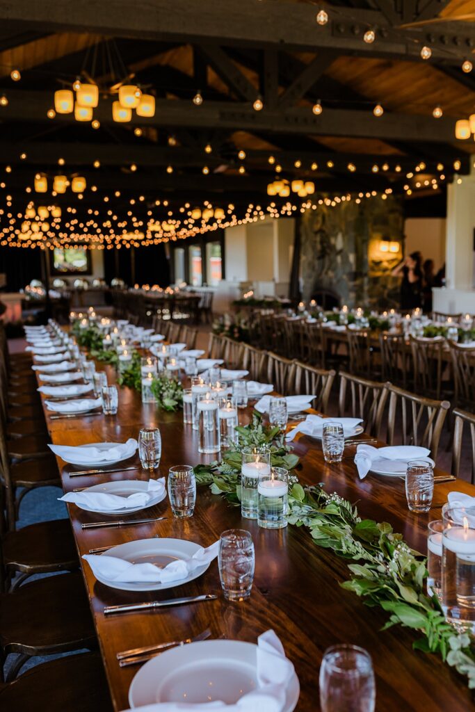The reception design was elegant and relaxed—wood tables, greenery runners, soft candlelight, and those signature Tannenbaum ceiling lights that always add that extra glow.
